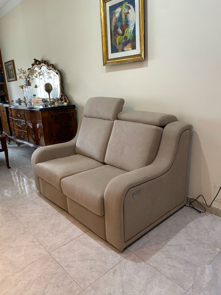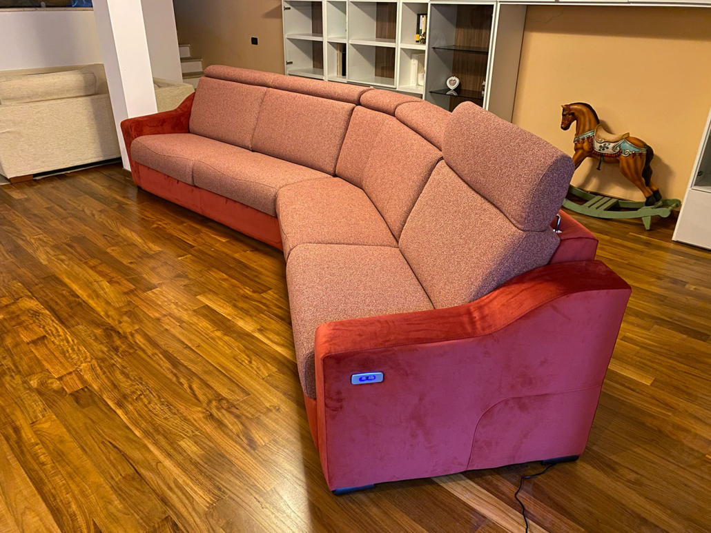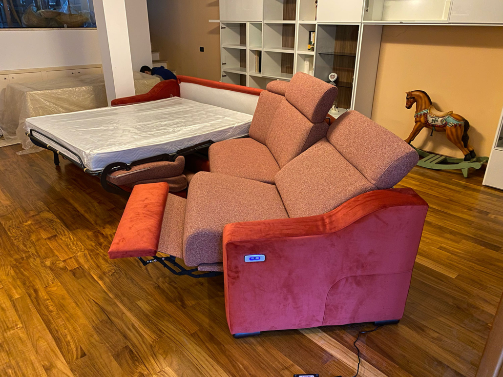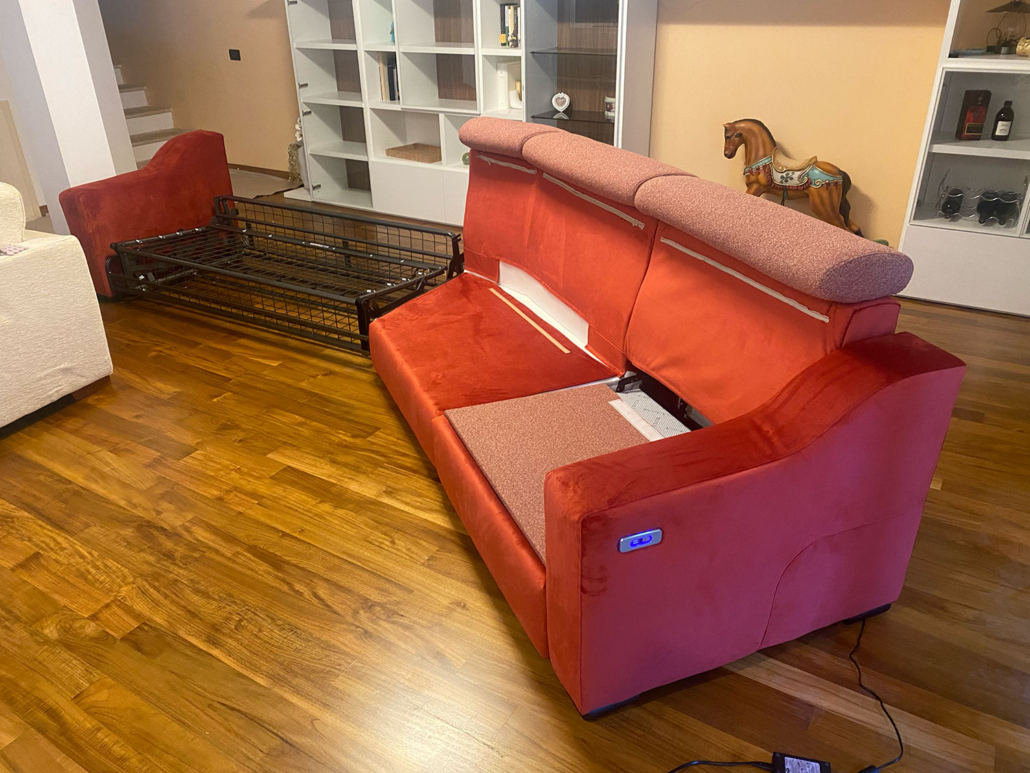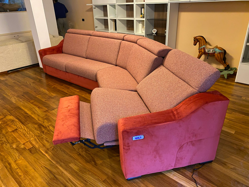Meccanismo relax, L’intero meccanismo è verniciato con polveri epossidiche esenti da solventi e componenti nocivi, l’apertura del meccanismo è azionata elettricamente tramite pulsantiera, si possono decidere diverse pulsantiere, anche touch-screen con USB. Nel caso in cui il divano dovesse essere posizionato al centro della sala, si potrà installare una batteria al litio. I divani sono tutti raso-muro, quindi non dovranno essere staccati dal muro