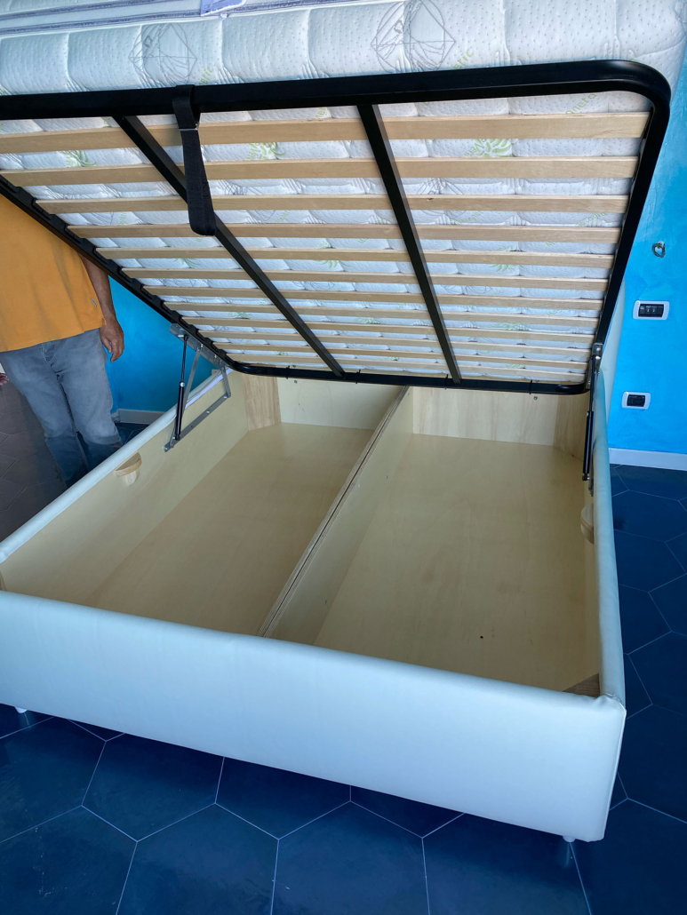 Meccanismo di sollevamento munito di rete con tre barre di rinforzo, telaio a sezione quadrata con doghe in faggio. L’intera rete è verniciata con polveri epossidiche esenti da solventi e componenti nocivi. Il movimento di apertura viene svolto da pistoni oleodinamici con potenza di sollevamento variabile da 600 N a 1500 N, in funzione del peso e della grandezza del materasso e della rete. N.B SI POSSONO UTILIZZARE RETI ELETTRICHE CON MOTORI A SCOMPARSA PER NON OCCUPARE SPAZIO NEL CONTENITORE.